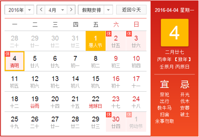 1.清明(míng)節放假時(shí)間(jiān):2016年(nián)4月3日至4月4日共2天。4月3日(星期日)、4月4日(星期一(yī)、農曆清明(míng)節)放假。4月5日(星期二)正常上(shàng)班。