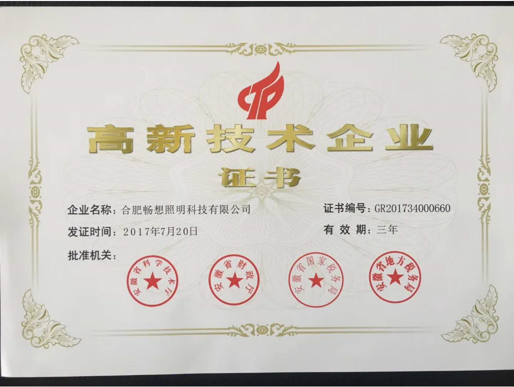 2017年(nián)7月20日,合肥瑤海區萊德燈具店榮獲由合肥市科技創新委員(yuán)會、合肥市财政委員(yuán)會批準頒發的“高新技術(shù)企業認定”,證書(shū)編号:GR201734000660。