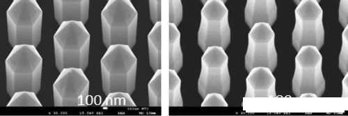 掃描電子顯微(wēi)鏡的影像顯示,單一(yī)直徑的柱狀像素會發射單一(yī)色光(guāng)(左),不過若将其頂部窄化(右),同一(yī)像素就會發出兩種不同的色光(guāng);而透過添加第三個更窄的層,就可(kě)能(néng)發出第三種色光(guāng),也就是讓單一(yī)像素發射出紅(hóng)、綠(lǜ)、藍(lán)(RGB)三色混合出的白光(guāng)