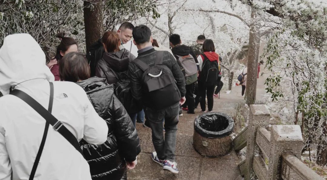 下(xià)山(shān)了(le),由于霧雪天氣路面濕滑,導遊:“小心腳下(xià),走中間(jiān)。”(你還手叉褲兜,還看(kàn)手機,不得不佩服,路是真滑!)