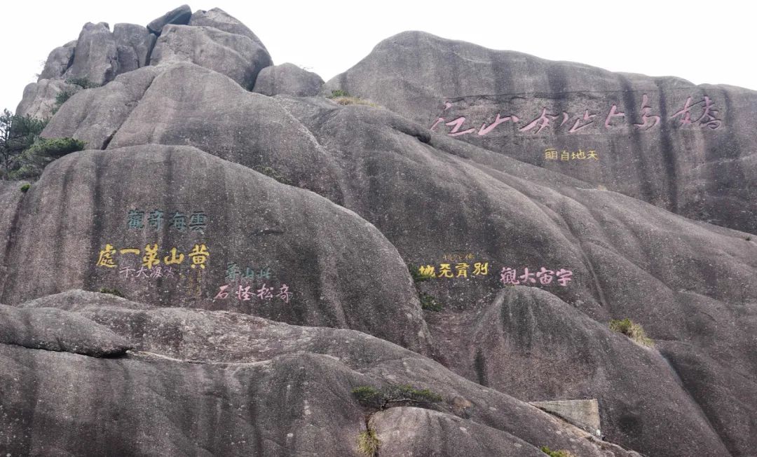 摩崖石刻,峰石上(shàng)刻有毛澤東草書(shū)“江山(shān)如(rú)此多嬌”。徐霞客曾稱它為(wèi)“黃(huáng)山(shān)絕勝”。